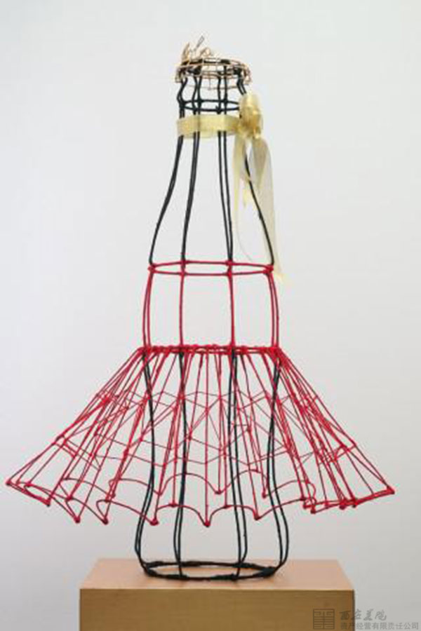 “將中國(guó)瓷瓶打碎成片,疏密有序的垂吊組合成可口可樂(lè)弧形瓶,材質(zhì)的形變幻化出濃濃的中國(guó)味,同時(shí)又賦予作品具有風(fēng)鈴的悅耳之聲,兼具視覺(jué)和聽(tīng)覺(jué)的雙重享受。”