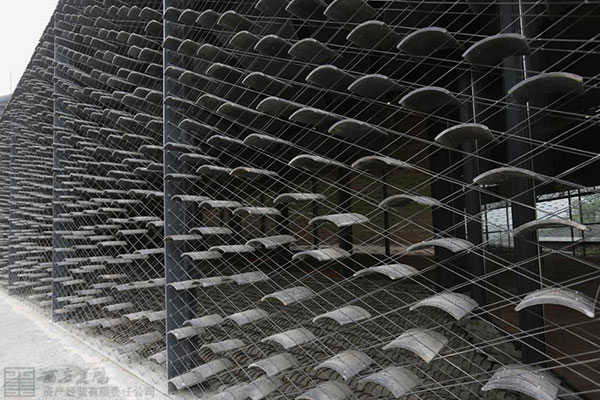 ↓屋瓦的使用遍及立面,固定在交織的不銹鋼絲上